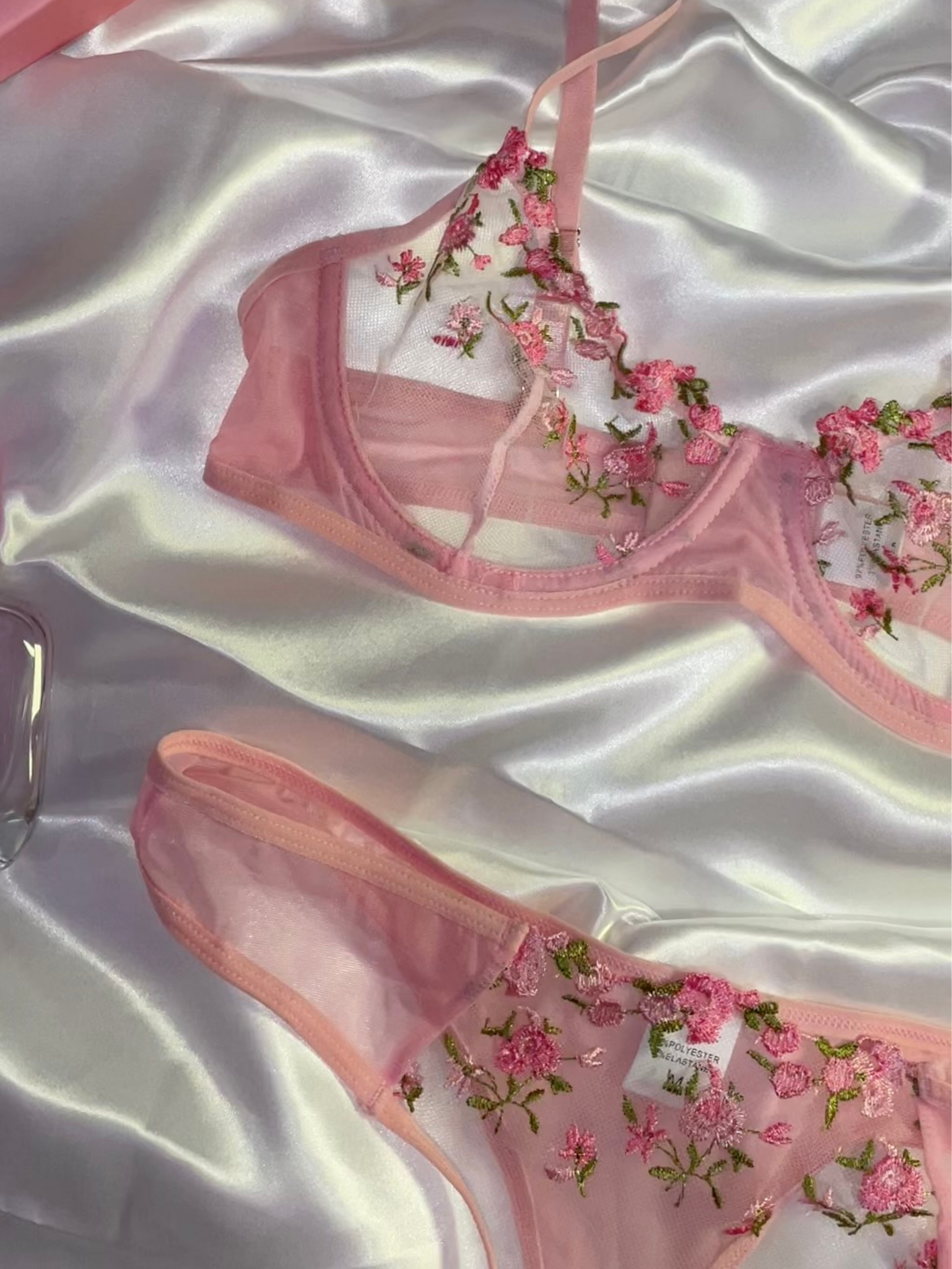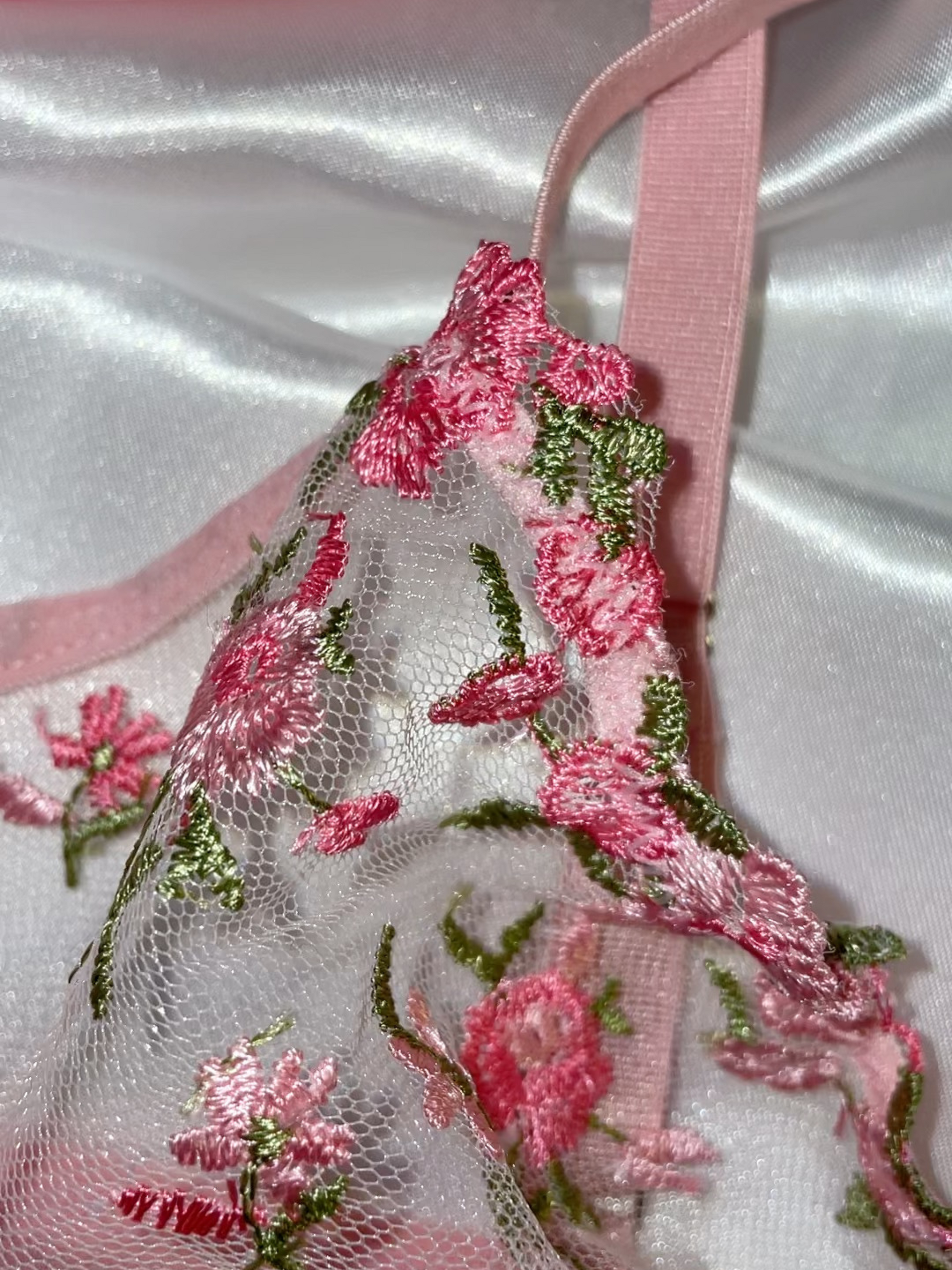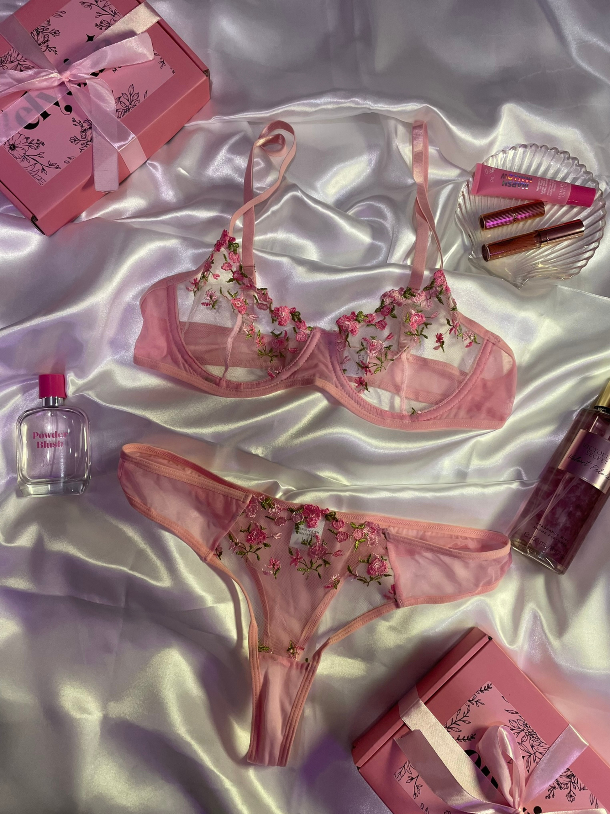 Romantic, delicate, and effortlessly enchanting—the Gardenia Blossom set is designed to celebrate femininity with soft blush tones and intricate floral embroidery on sheer mesh. This dreamy two-piece ensemble embodies grace and confidence in every detail.