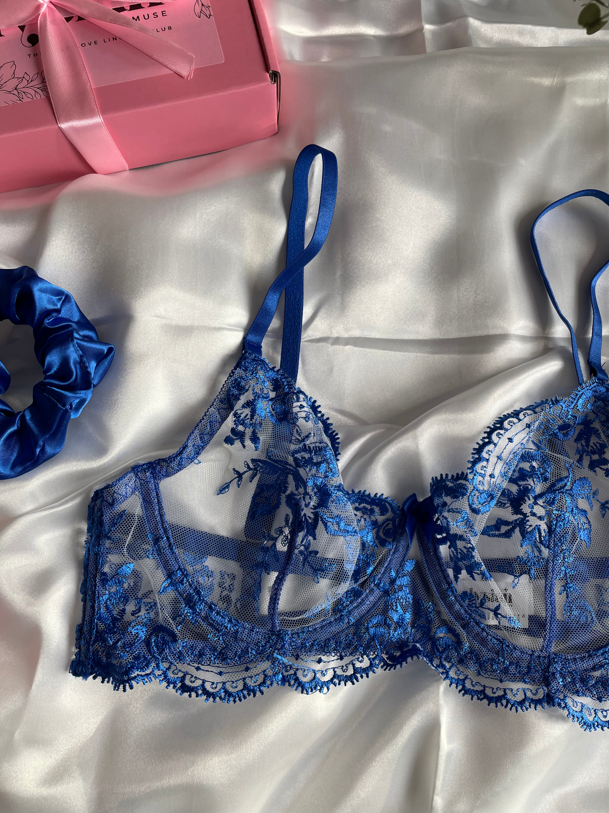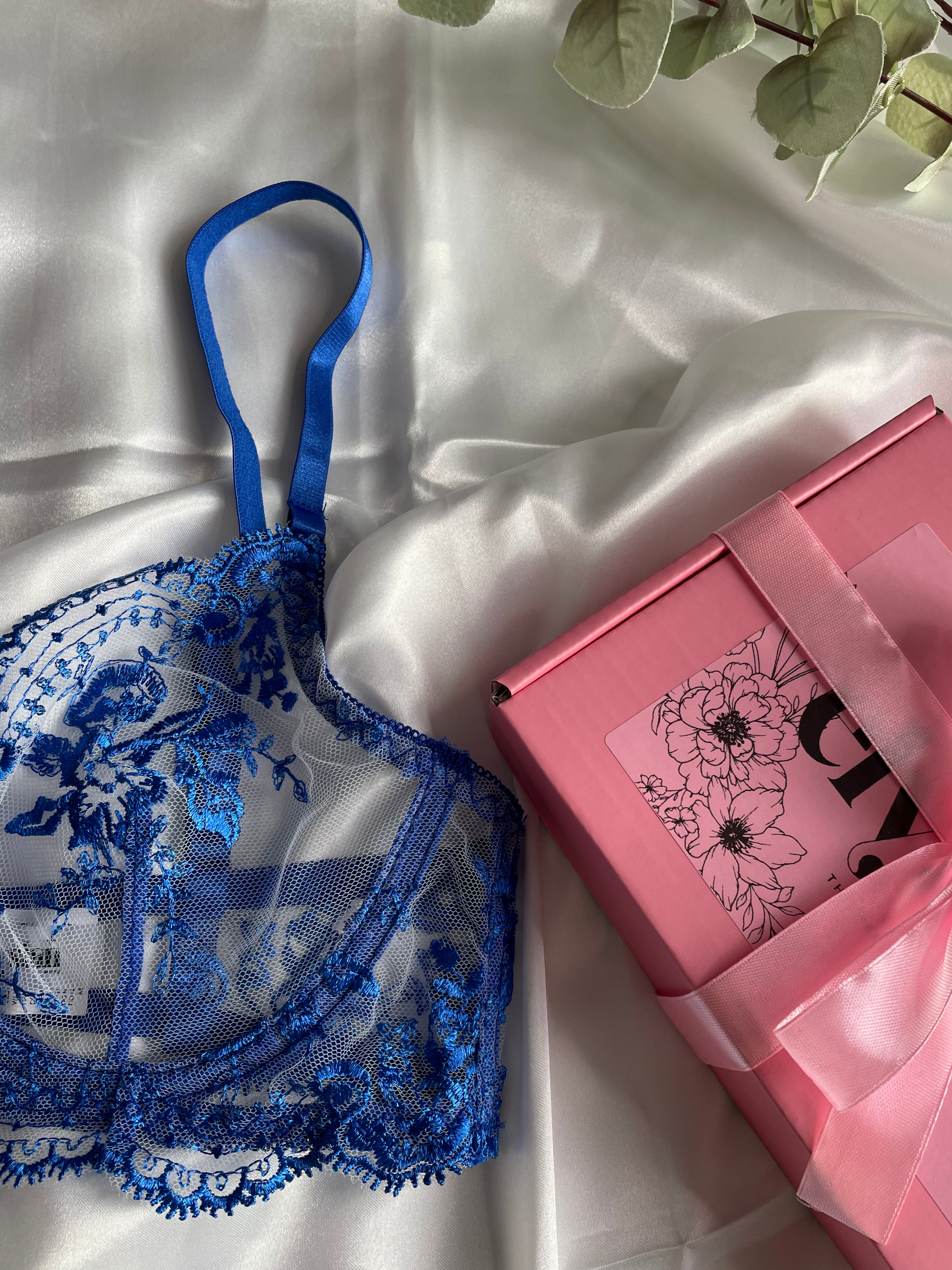 Crafted from delicate sheer mesh and adorned with exquisite sapphire-blue floral embroidery, the Sapphire Dreams set is an ode to divine femininity. The underwired bra offers elegant structure without compromising on comfort, while the matching thong features striking strap detailing and a flattering, high-cut silhouette.