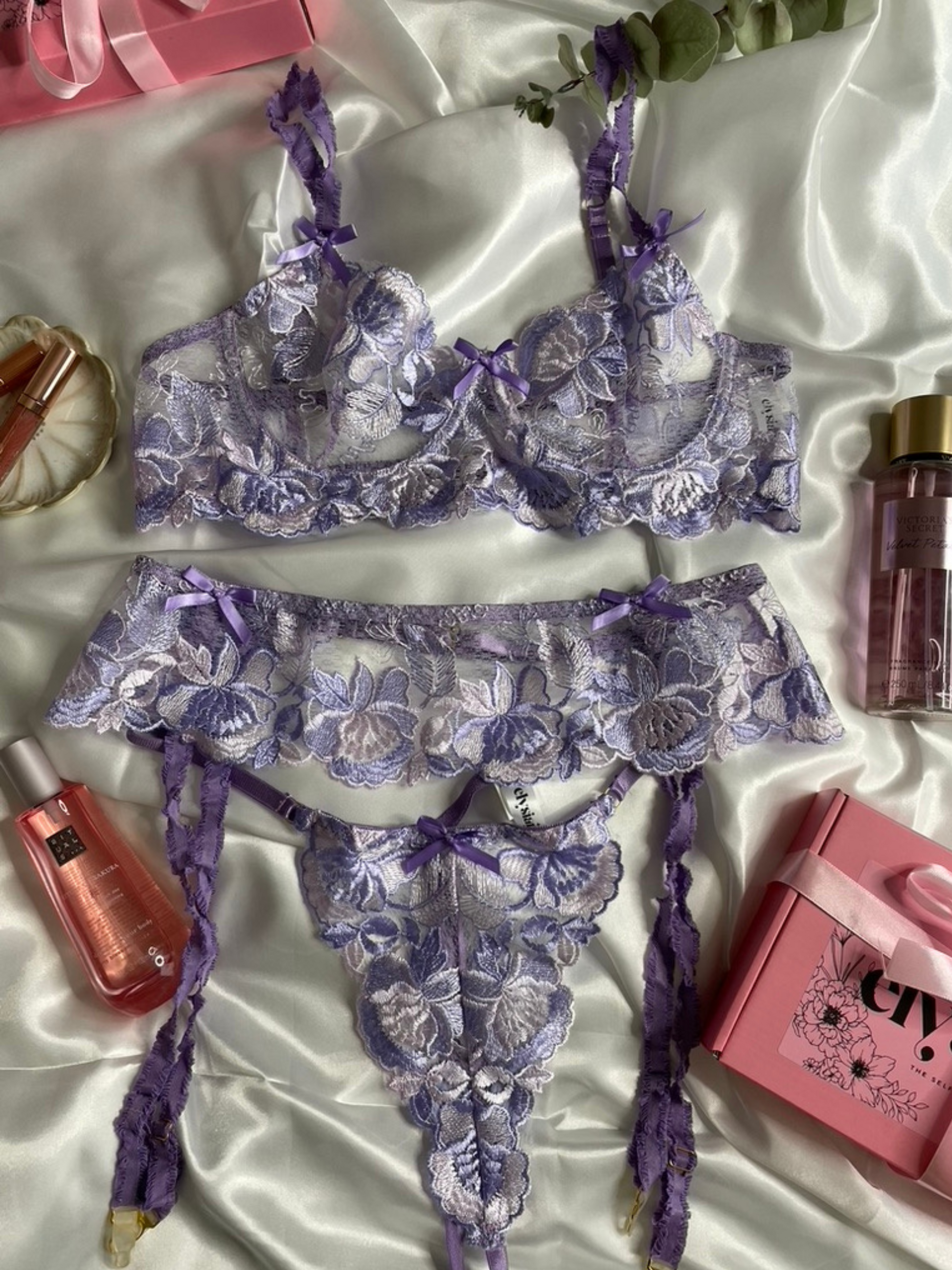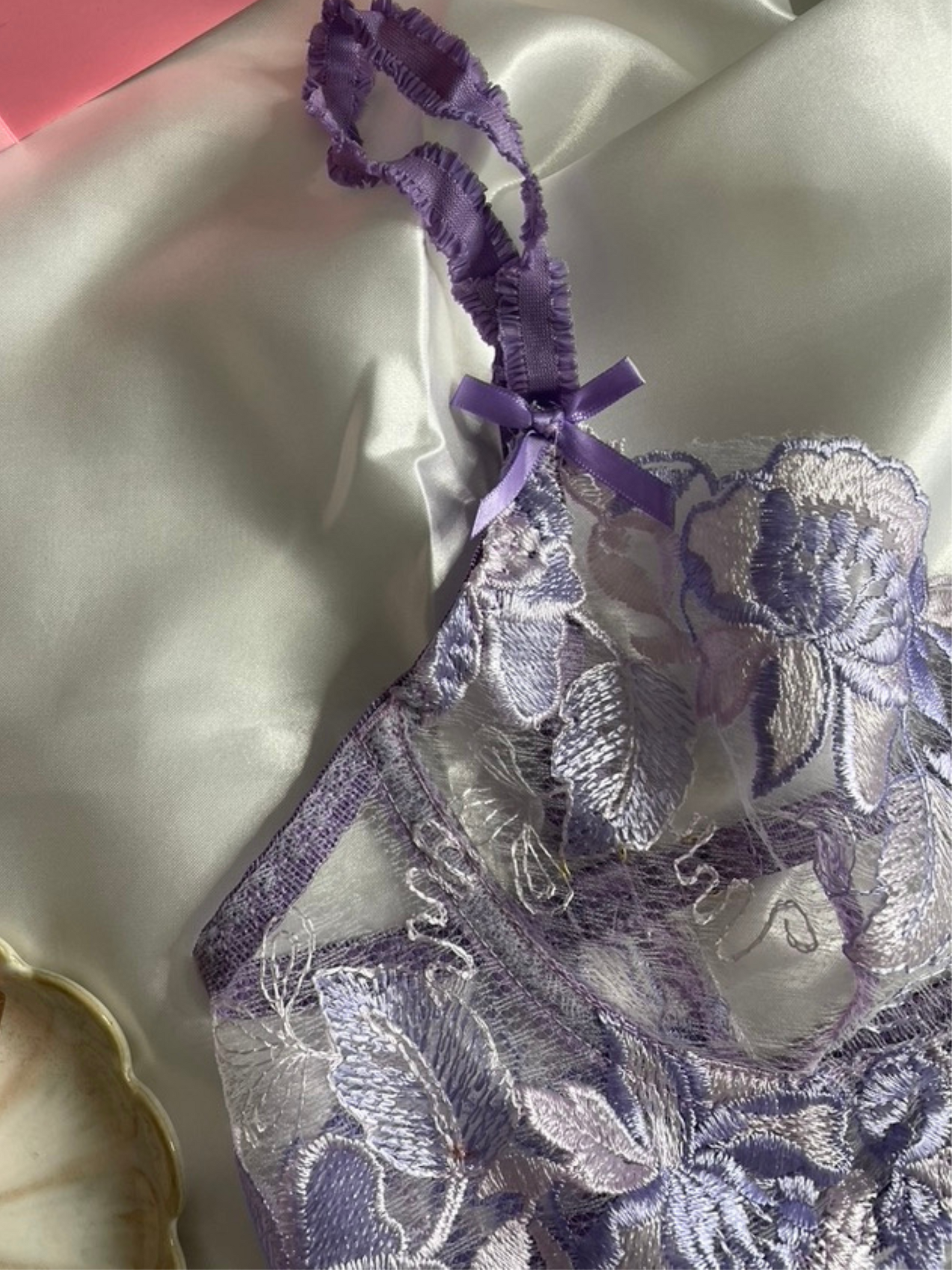 ๐Ÿ’œ Underwired Bra โ€“ Soft lilac lace and floral embroidery offer gentle support and an effortlessly elegant silhouette.